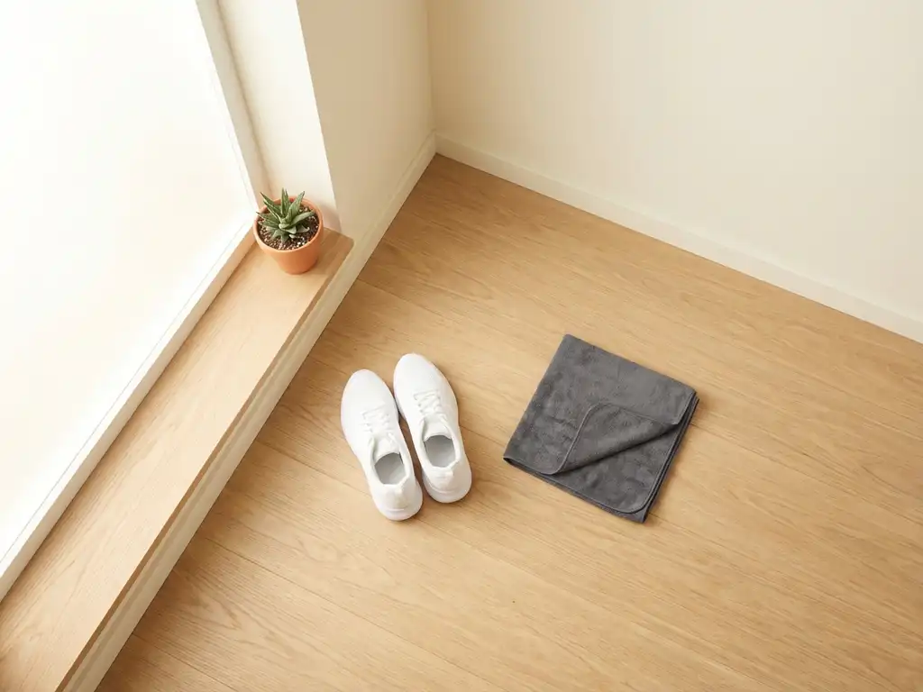 Witte sportschoenen naast grijze handdoek op houten vloer met natuurlijk licht en kleine vetplant